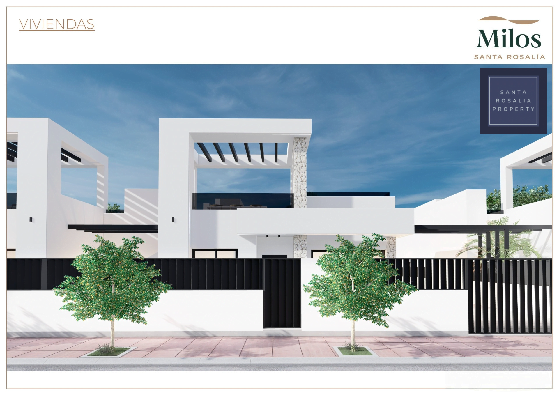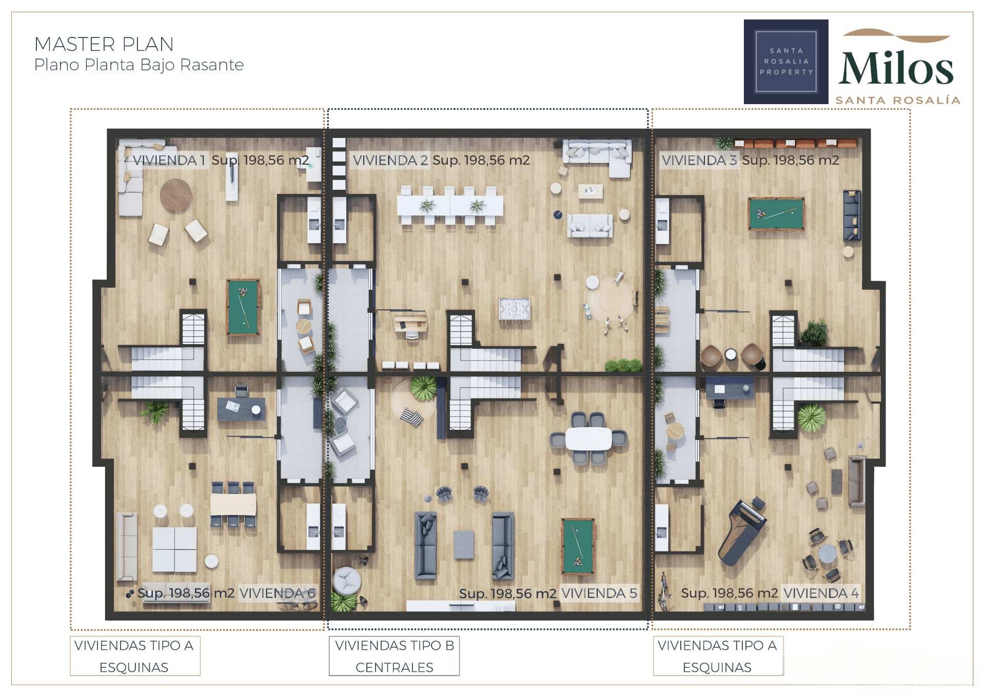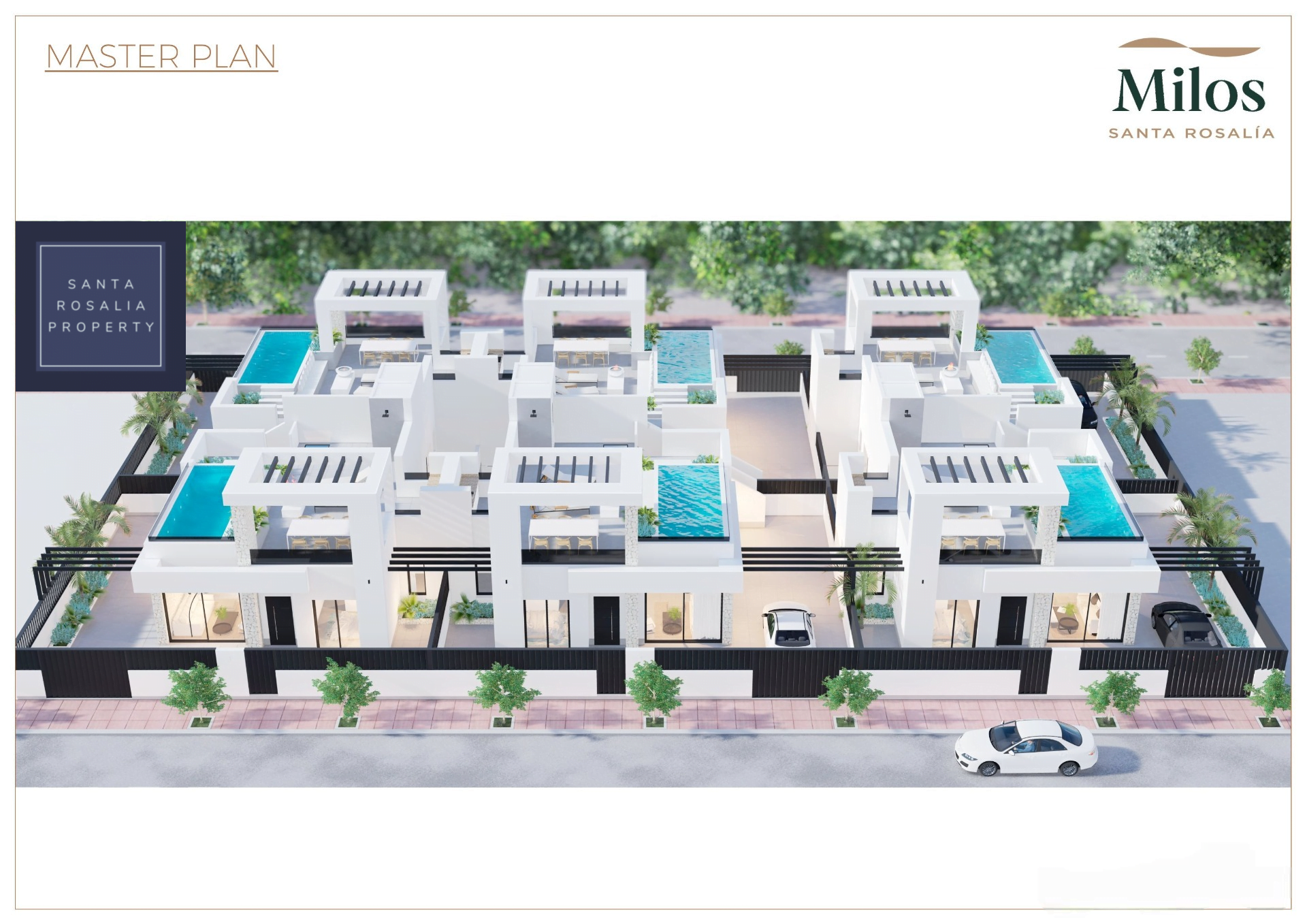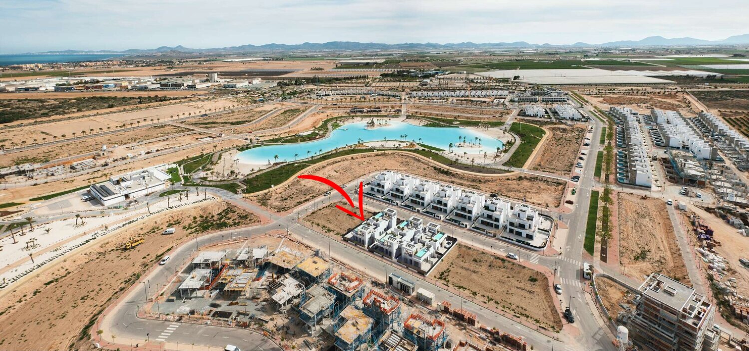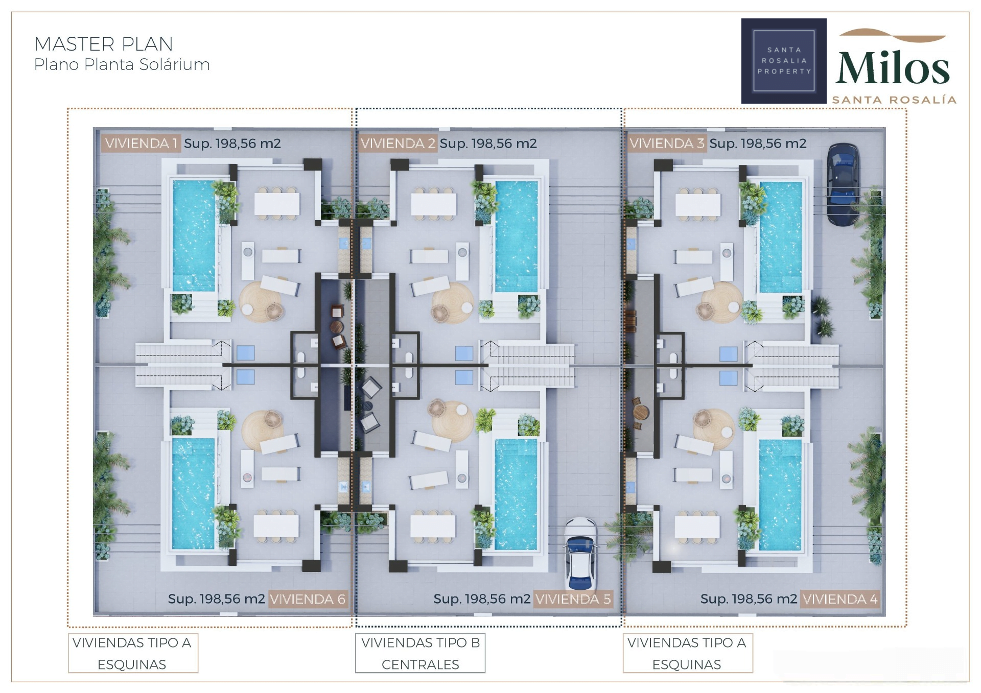 Located in a great central position close to the lagoon. 6 Milos villas with 3 bedrooms, 2 bathrooms all on one level + large impressive multi purpose fully finished basement room of around 125.00m². Iconic roof solarium that also includes a fantastic swimming pool.