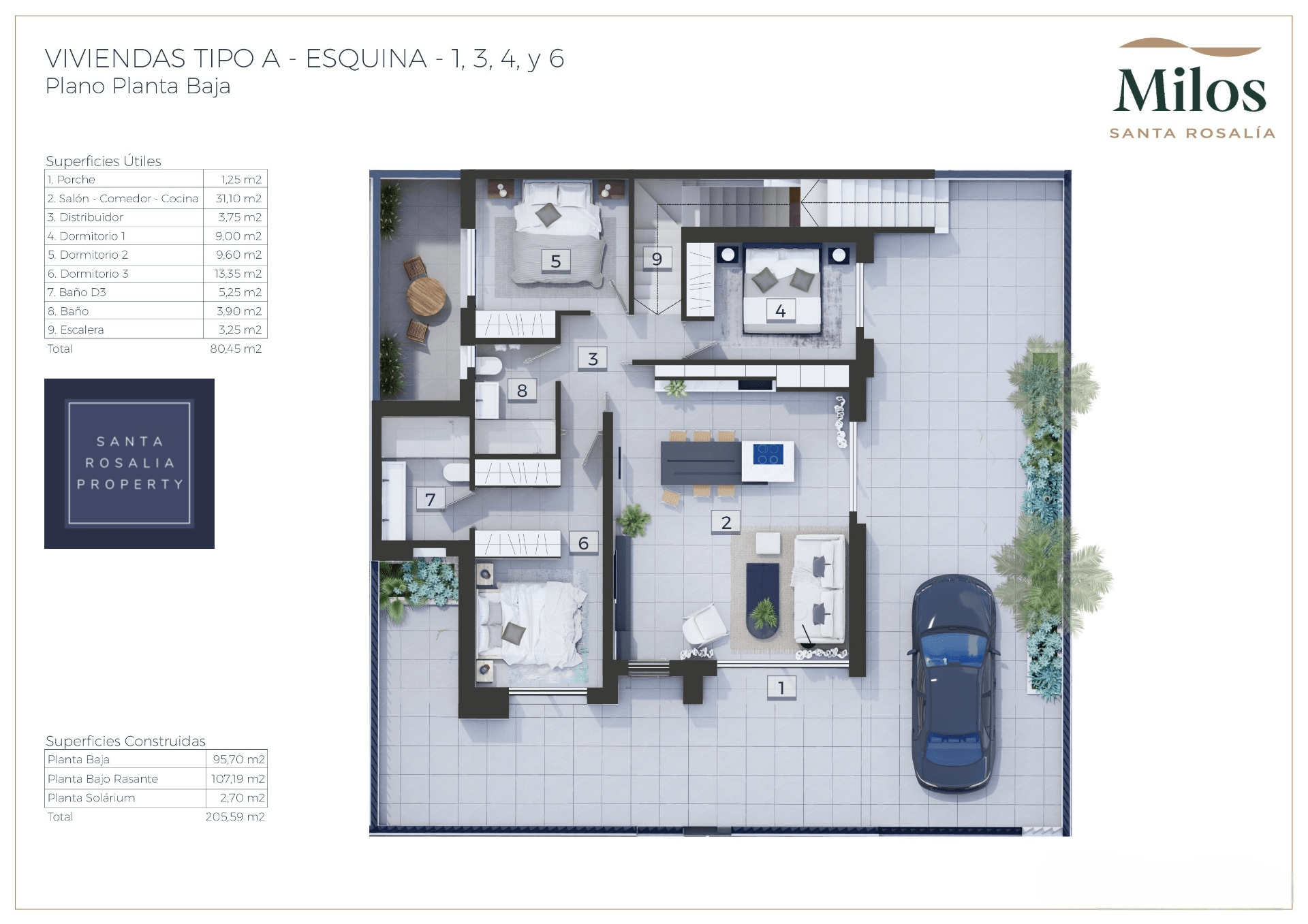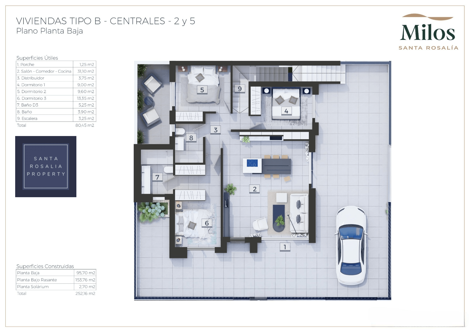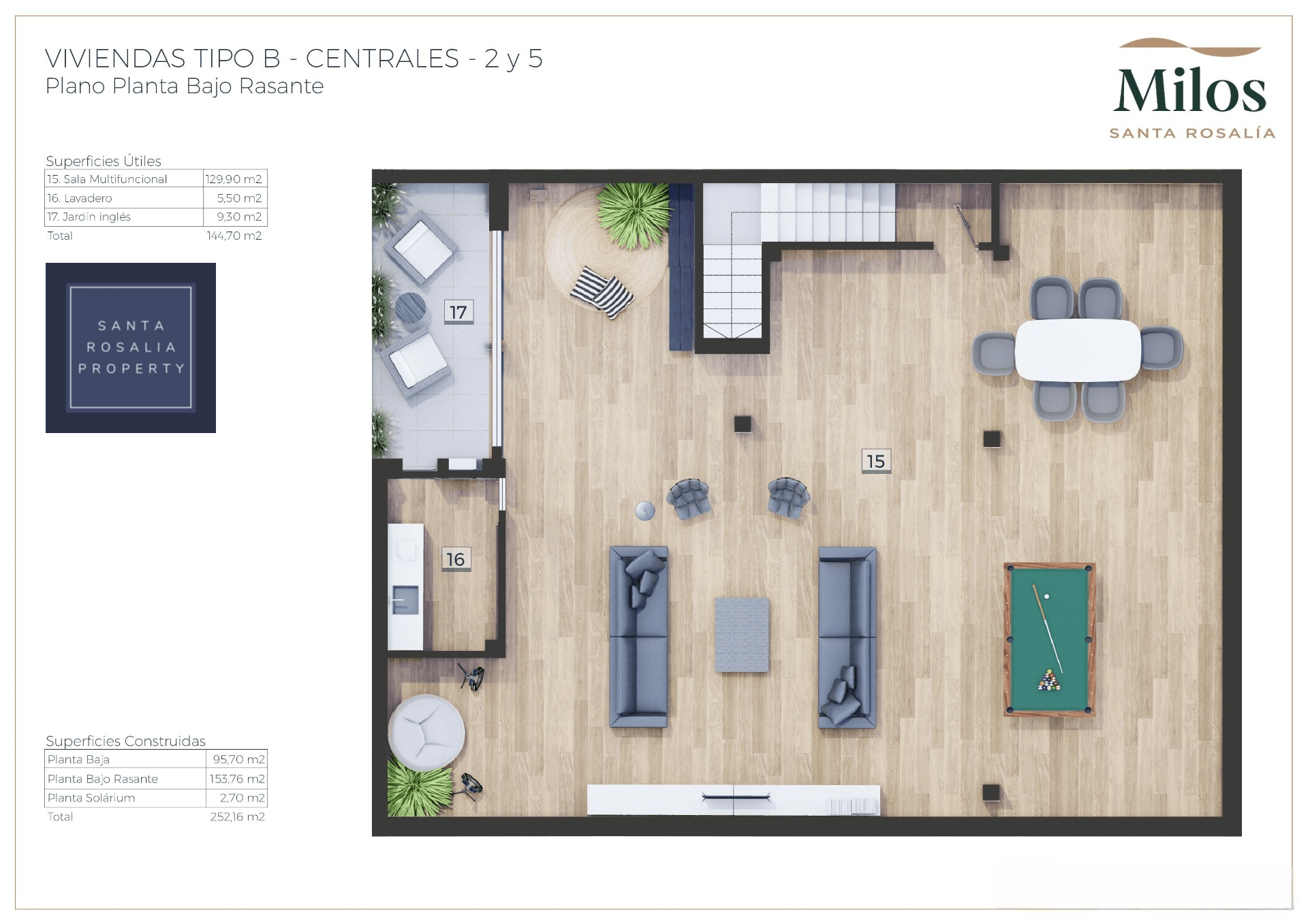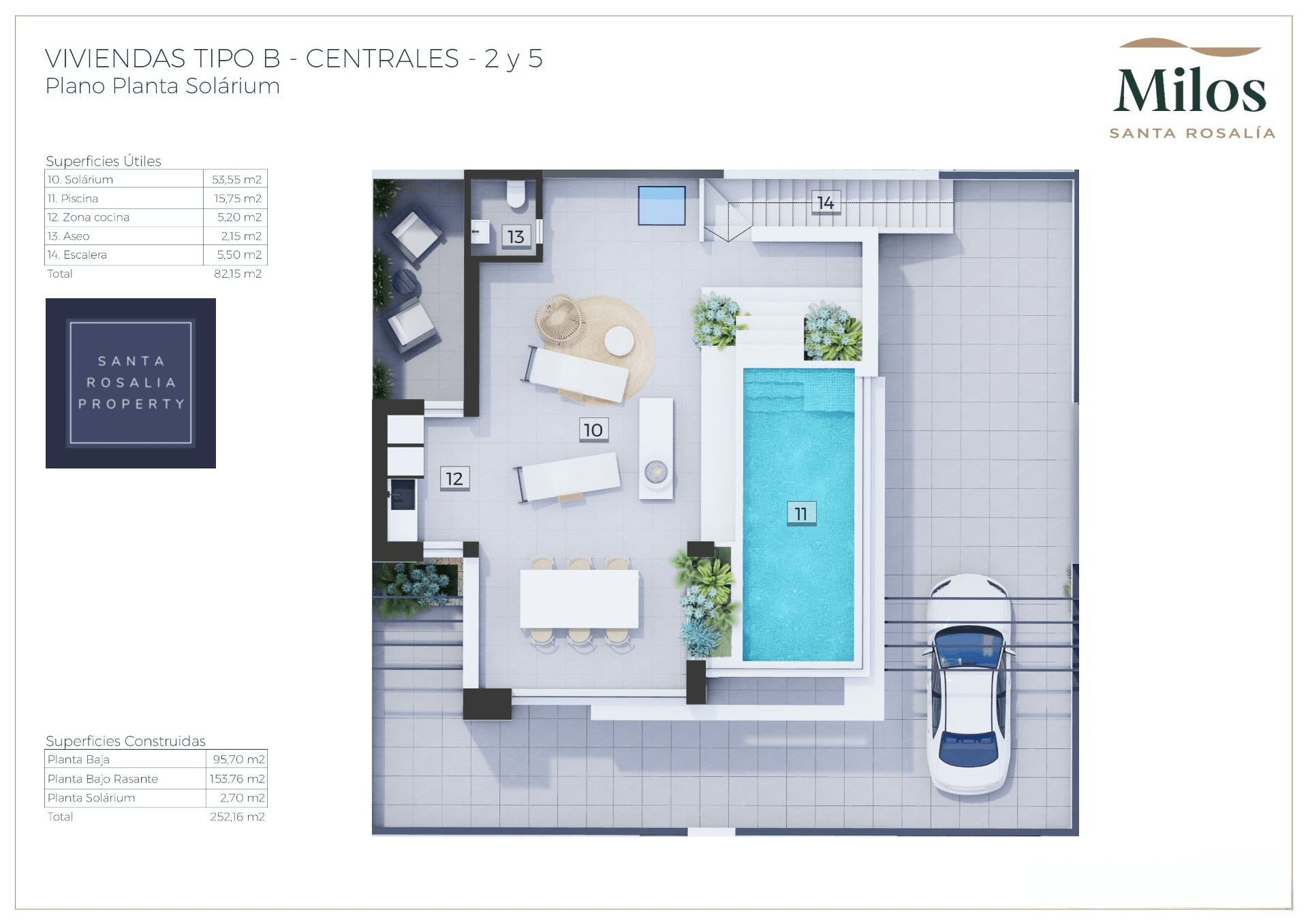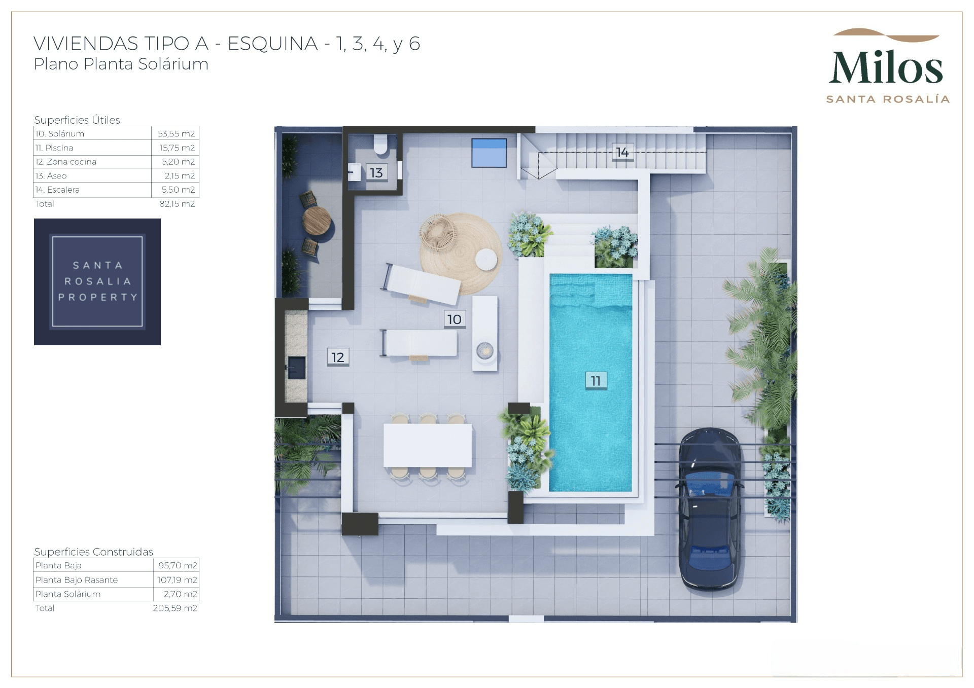 Located in a great central position close to the lagoon. 6 Milos villas with 3 bedrooms, 2 bathrooms all on one level + large impressive multi purpose fully finished basement room of around 125.00m². Iconic roof solarium that also includes a fantastic swimming pool.
