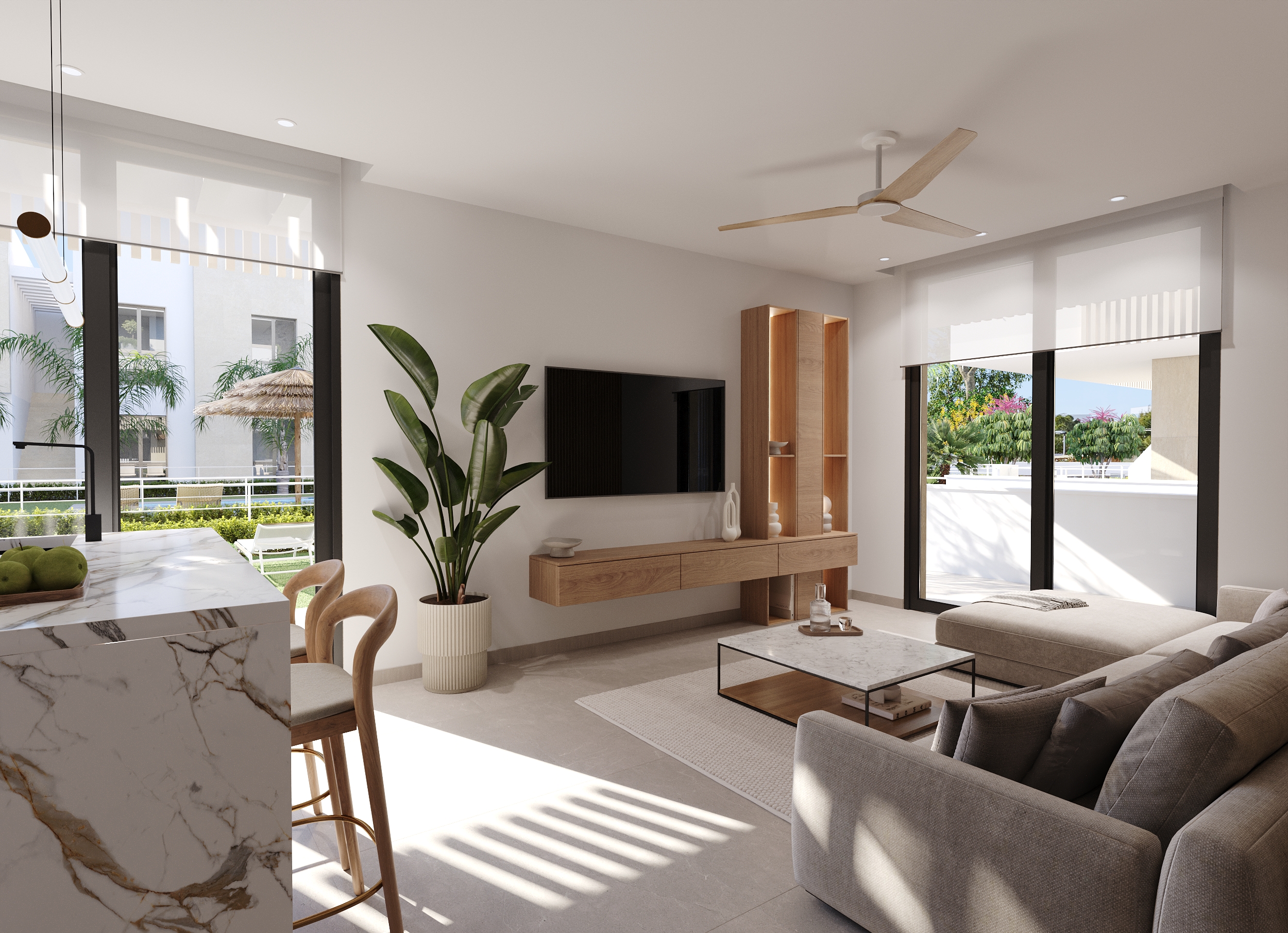 Ground floor apartments offer spacious private gardens ideal for outdoor enjoyment, while first and second floor residences boast generous terraces, perfect for outdoor relaxing. The penthouses crown the development with expansive solariums — stunning spaces for relaxation or entertaining under the open sky.